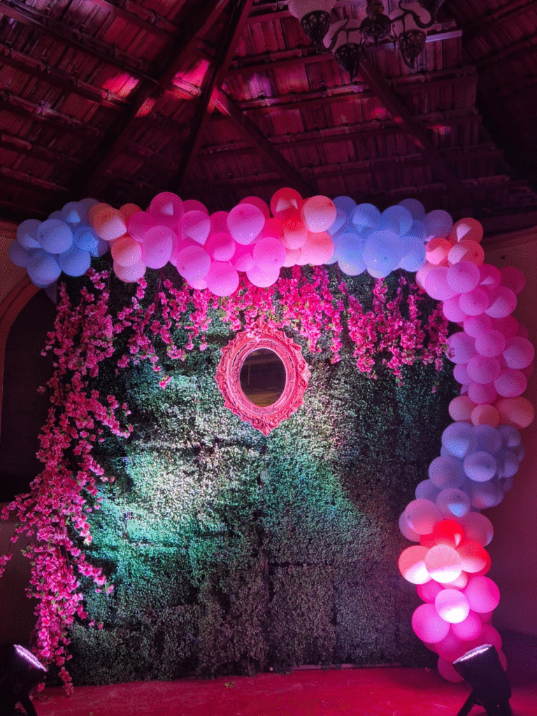 At Creative Affairs, we believe every celebration should feel like stepping into a dream, and Elliorah’s first birthday was our chance to bring a timeless fairytale to life. Inspired by the whimsy of Alice in Wonderland, we designed a celebration that whisked guests away into a magical world of pastel colours, oversized props, and playful details. From the entrance arch of pink, lilac, and blue balloons to the oversized pocket watch, fluttering butterflies, and vintage birdcages, every corner invited guests to explore a little bit of Wonderland. Our team handcrafted a lush green backdrop dripping with cascading blooms and framed it with a delicate mirror perfect for that storybook photo moment.